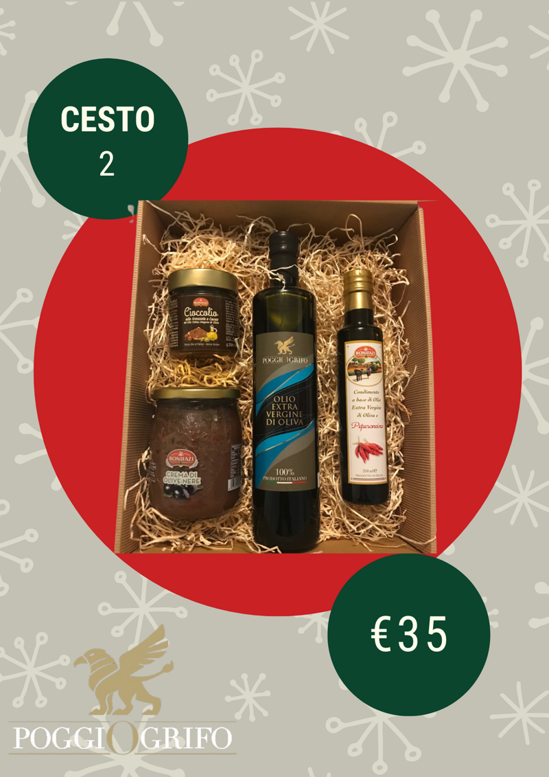 1 Olio 100% italiano da lt.0,75, 1 Cioccolio alla Nocciola e Cacao da g.250, 1 Crema di Olive da g.500, 1 Olio aromatizzato da lt.0,25